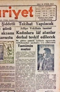 | 10.06.1953 | Türk Ceza Kanunu’nda değişiklikler yapıldı. Kadınlara ve genç erkeklere sözle sarkıntılık yapanlara 3 aydan 1 yıla kadar, elle sarkıntılık yapanlara da 6 aydan 2 yıla kadar ceza öngörüldü. |