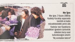 Kadın örgütleri, cinsel tacize dikkat çekmek için ‘Bedenimiz Bizimdir, Cinsel Tacize Hayır’ kampanyası başlattı. Karaköy-Kadıköy vapurunda yapılan basın açıklaması sonrası kadınlara mor iğne dağıtıldı. Kampanya, ‘Mor İğne’ adıyla duyuldu.