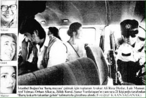 1994 | Müjdat Gezen’in çağrısıyla ve Nasrettin Hoca’nın Akşehir Gölü’ne yoğurt mayasını çalmaya kalkmasından ilhamla, Beşiktaş İskele’de toplanarak İstanbul Boğazı’na “Barış Mayası” çalmak isteyen sanatçılar gözaltına alındı. Sanatçıların ve yurttaşların yakalarında “Barış için sen de bir şey yap” kokartı vardı. Gözaltına alınanlar arasında Atıf Yılmaz, Orhan Alkaya, Jülide Kural, Lale Mansur, Şanar Yurdatapan ve Avukat Ali Rıza Dizdar da bulunuyordu.![]() |