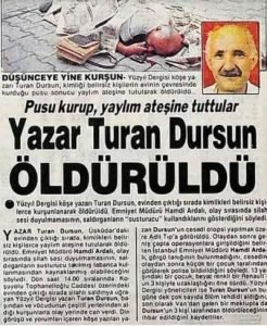 1990 | Müftülükten istifa eden, İslam araştırmacısı, çok sayıdaki eserin sahibi ve İkibine Doğru ile Yüzyıl dergisi yazarı, Turan Dursun, İstanbul’da Koşuyolu’ndaki evinden çıkarken, kimliği belirsiz kişilerin silahlı saldırısı sonucu 56 yaşında öldürüldü. Saldırganlar olaydan sonra kaçtı. Şeriat karşıtı yazılarıyla tanınan Turan Dursun’un bir süreden beri aşırı dinciler tarafından ölümle tehdit edildiği öğrenildi. Cinayeti “İslam Mücahitleri” adlı bir örgüt üstlendi.![]() |