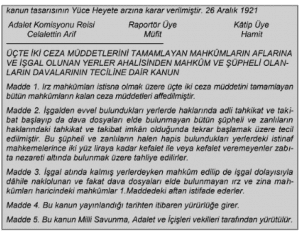 Türkiye Büyük Millet Meclisi‘ne, hükumet tarafından, 1921 yılında çıkarılan kısmi afların yetersiz olduğu gerekçesiyle 27 ekim 1921 tarihinde bir teklif verilerek; “Dava Dosyaları İşgal Sahasında Kalan Mahkum ve Şüpheliler Hakkında Kanun Tasarısı” adıyla bir tasarı verilmiş, bu teklif ile “İşgale uğrayan yerlerden içerilere nakledilen cinayet şüphelileri ile zanlılarına ait evrak ve kayıt vesaire nakledilememiş veya nakil esnasında zarara uğramış ise bu gibiler imkân dâhilinde takibatları tehir olunmak üzere bulundukları yerler istinaf mahkemelerince takdir edilecek kefaletle tahliye olunası, suç mahiyeti idam ve müebbet hapis cezası ise bu gibi şüpheli ve zanlıların tahliyeden istifade edememesi, cinayet suçu ile yargılananların cezalarının beşte birini çekmiş olmaları halinde tahliye olmaları, kefaletle tahliyenin mümkün olması” teklif edilmiştir.