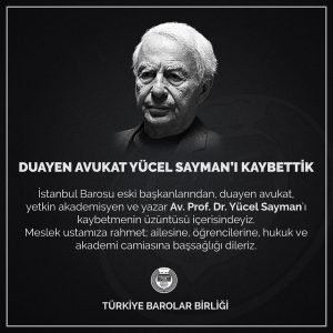 “İstanbul Barosu eski başkanlarından, duayen avukat, yetkin akademisyen ve yazar Av. Prof. Dr. Yücel Sayman’ı kaybetmenin üzüntüsü içerisindeyiz. Meslek ustamıza rahmet; ailesine, öğrencilerine, hukuk ve akademi camiasına başsağlığı dileriz.”