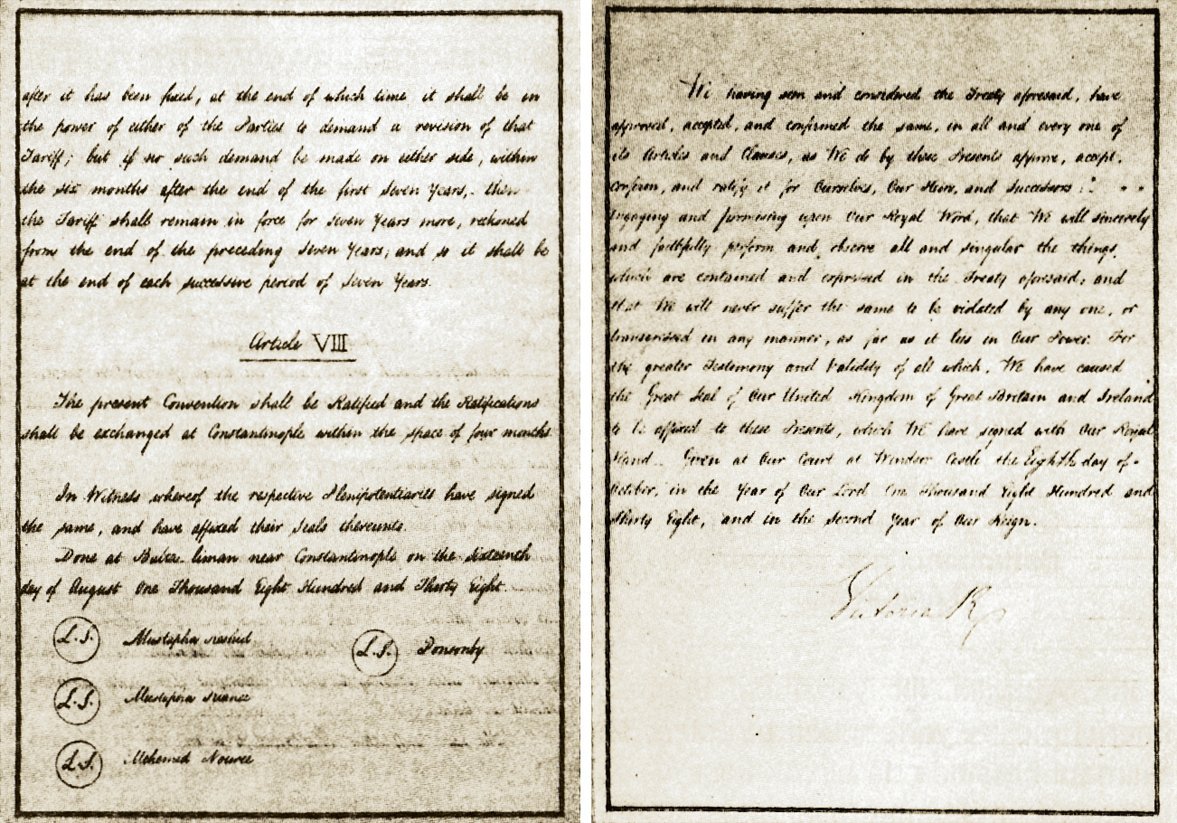 Anlaşma, 8 Ekim 1838’de Kraliçe Viktorya, bir ay sonra da Sultan II. Mahmut tarafından onaylanmıştır.