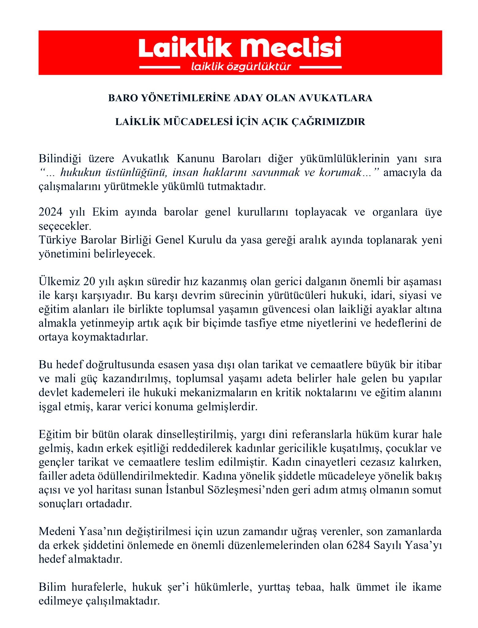 Bildiri, 2024 yılı baro seçimlerinde, yönetime ve diğer kurullara aday olan avukatlara yönelik bir çağrı metnidir. Özellikle, Laiklik Meclisi, tüm avukatları ve baroları, laiklik mücadelesine davet etmektedir. Ayrıca, çağrı metninde, hukukun üstünlüğüne, insan haklarını savunma ve koruma görevleri hatırlatılmıştır. Ayrıca, laikliğin tasfiyesine karşı Türkiye Barolar Birliği’nin bir bütün olarak karşı durması gerektiği açıklanmıştır.