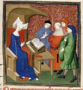 Christine de Pisan, kitaplarında kadınların toplumsal var oluşa katkılarını ele almış, kadın düşmanlığının nasıl azalacağını işlemiş ve çözüm aramıştır. Pisan, 1429 yılında Jan Dark Masalı adlı eseri yazmış, bir kadının, kendi cinsinin yüceliğini savunması temasını işlemiştir.