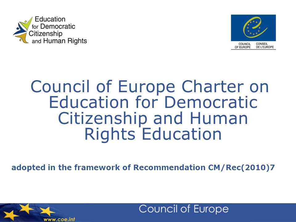Avrupa Konseyi Demokratik Vatandaşlık ve İnsan Hakları Eğitimi Şartı, (CM/Rec(2010)7 sayılı Tavsiye Kararı) Avrupa Konseyine üye 47 ülke tarafından kabul edilmiştir. Şart geniş kapsamlı istişareler ve birkaç yıl süren çalışma sonucunda hazırlanmıştır. Üye ülkeler bakımından bağlayıcı olmayan ve tavsiye niteliğinde olan Şart, vatandaşlık ve insan hakları konularına ilgi duyan herkes için temel başvuru belgesidir. İnsan hakları alanında devletlerin iyi uygulamalar geliştirmesi ve bu kültürü gerek Avrupa’da ve gerekse Avrupa ötesinde yaymanı ve standartları yükseltmenin yolu tavsiye kararı ve ekinde yayınlanan metin ile çizilmiştir.