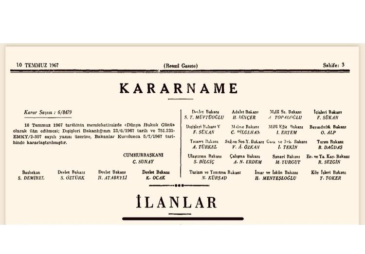 Türkiye’de dünya ile birlikte hukuk gününün kutlanması “Dışişleri Bakanlığının 23/6/1967 tarih ve 751.231- EMKY/2-307 sayılı yazısı üzerine, Bakanlar Kurulunca 5/7/1967 tarihinde kararlaştırılmıştır.”