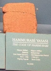 Babil Kralı Hammurabi’nin (MÖ 1728-MÖ 1686) çeşitli meselelerde verdiği kararlar, Babil’in koruyucu tanrısı Marduk adına yapılan Esagila Tapınağı’na dikilen bir taş üzerine Akatça dilinde yazılmıştır. Hammurabi, kendisine bu kanunları yazdıranın güneş tanrısı Şamaş’ın olduğunu söylemiştir. Dolayısıyla kanunlar da tanrı sözü sayılmıştır.