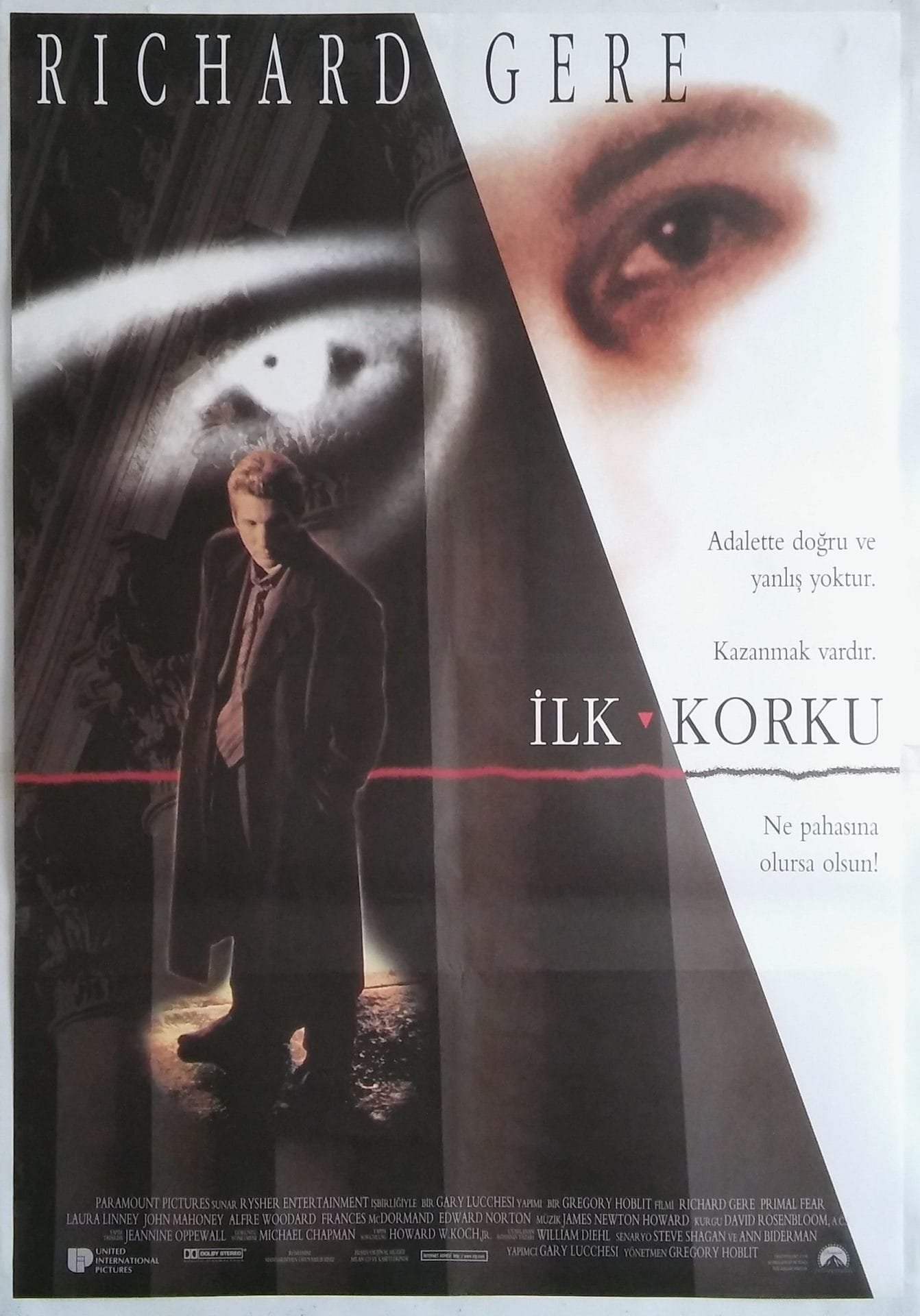 Edward Norton’ı sahneye çıkartan film olarak bilinen “İlk Korku”, ‘sanık-avukat ilişkisi” üzerine en yetkin sinema eserlerinden biridir. Norton-Gere arasındaki dönüşümlü ve psikolojik çekişme etkisini halen yitirmemiştir.