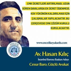 Hasan Kılıç: Biz bedel ödeyen avukatlar olarak bütün haklarımızı talep ediyoruz, hepsini istiyoruz, ekonomik bir takım hakları istiyoruz. Birçok alanda, örneğin veraset ilamı ile ilgili, vekaletname çıkarma ile ilgili, şirketlerle ilgili, gayrimenkul alım satımı ile ilgili olarak, bu ve benzer konularda hem vatandaşı korumak, hem avukatın çalışma alanını doğru hale getirmek için istediğimiz projeler var. CMK’da avukatların angarya altında çalıştırılmasını önleyeceğiz. Ücretler asgari ücretin altında olmamalı. Biz bunları bıkmadan, yılmadan söyleyeceğiz. Çünkü biz haklı ve güçlüyüz, gücümüzü haklılıktan alıyoruz, bıkmadan yılmadan söyleyeceğiz, herkesten talepte bulunacağız, doğruları dile getireceğiz, yapıcı görüşler ortaya koyacağız, olmadığı zaman da en sert, en dirençli, en etkin şekilde tavrımızı ortaya koyacağız.