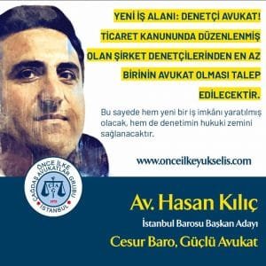 Hasan Kılıç: Bütün hukukçuların ve yurttaşların ortak duyarlılığını dile getirmek ve hukuku savunmak için baromuzun yaklaşan genel kurulunda adayız. Meslektaşların ihtiyaçlarına ve yaşadıkları zorluklara gözlerini kapatmayan bir baro yönetimi gerekli. Avukatların köklü sorunları bulunmaktadır. Bu sorunlar görmezden gelinmemelidir. Her sorunumuzla ilgili ayrıntılı çalışmalar ve yol haritaları hazırdır ve sunulacaktır. Çözüm için önümüzde atılacak çok adım ve yürüyecek coşku dolu bir yolumuz bulunmaktadır. Enerjisi yüksek direnci fazla etkinliği düşmeyen saygınlık içinde, eğilmeyen bükülmeyen bir baro gereklidir ve biz bunu sağlamak için aday olduk.