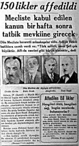 Lozan Barış Antlaşmasına ek olarak taraf devletlerce kabul edilen ve açıklanan, 1914 – 1922 yılları arasında işlenen savaş suçlarına ilişkin umumi af beyannamesine ek protokolde Türk Devleti bu genel aftan 150 kişiyi muaf tutacağını beyan etmiştir. Türk hükümeti Lozan Antlaşması yükümlülükleri uyarınca 26 Aralık 1923 ve 16 Nisan 1924 tarihlerinde iki defa genel af kanunu çıkartmış, 150 kişiyi bu kanunlardan muaf tutmuştur. Bu kişilerin isimleri 01 Haziran 1924 tarihli 544 numaralı hükümet kararnamesi ile belirlenmiş, 28 Mayıs 1927 tarihli 1064 sayılı yasa ile bu kişiler vatandaşlıktan çıkartılmıştır. Bu kişiler 29 Haziran 1938 tarihli 3527 sayılı af kanunu ile affedilmiştir. Bu 150 kişinin bazıları aftan önce ölmüş, bazıları yurtdışında kalmaya devam etmiş, bazıları da Türkiye’ye geri dönmüştür.
