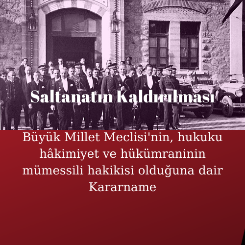 Saltanatın Kaldırılması, 1 Kasım 1922 tarihinde Türkiye Büyük Millet Meclisi’nin 308 nolu “Türkiye Büyük Millet Meclisi’nin, hukuku hâkimiyet ve hükümraninin mümessili hakikisi olduğuna dair” adlı kararname ile gerçekleşmiştir. Bu kararnameden 1 gün önce kabul edilen 307 nolu kararname ise “Osmanlı imparatorluğunun inkıraz bulup Türkiye Büyük Millet Meclisi Hükümeti teşekkül ettiğine dair” çıkarılmıştır. Arka arkaya çıkarılan iki kararname sonucunda Osmanlı İmparatorluğu resmen sona ermiş, saltanat kaldırılmış ve Türkiye Büyük Millet Meclisi Hükümeti teşekkül etmiştir.