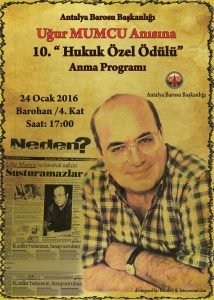 24 Ocak 2023 Salı günü, Uğur Mumcu Anma Etkinliğinde, 2022 Yılı Uğur Mumcu Özel Ödülü; adalet sistemindeki çürümeye, yaşam hakkı ihlallerine ve doğa katliamlarına karşı mücadelenin öncü isimlerinden Av. Şerafettin Can Atalay’a verilmiştir. Ödül, sahibi hapiste olması nedeniyle babası hapiste ola |