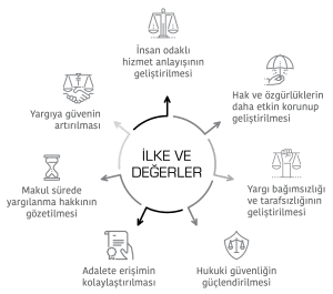 Yargı Reformu Strateji Belgesinin ana başlıkları; hukukun üstünlüğünün güçlendirilmesi, hak ve özgürlüklerin daha etkin korunup geliştirilmesi, yargı bağımsızlığı ve tarafsızlığının güçlendirilmesi, sistemin şeffaflığının artırılması, yargısal süreçlerin basitleştirilmesi, adalete erişimin kolaylaştırılması, savunma hakkının güçlendirilmesi ve makul sürede yargılanma hakkının daha etkin korunması” olarak sıralanmaktadır.